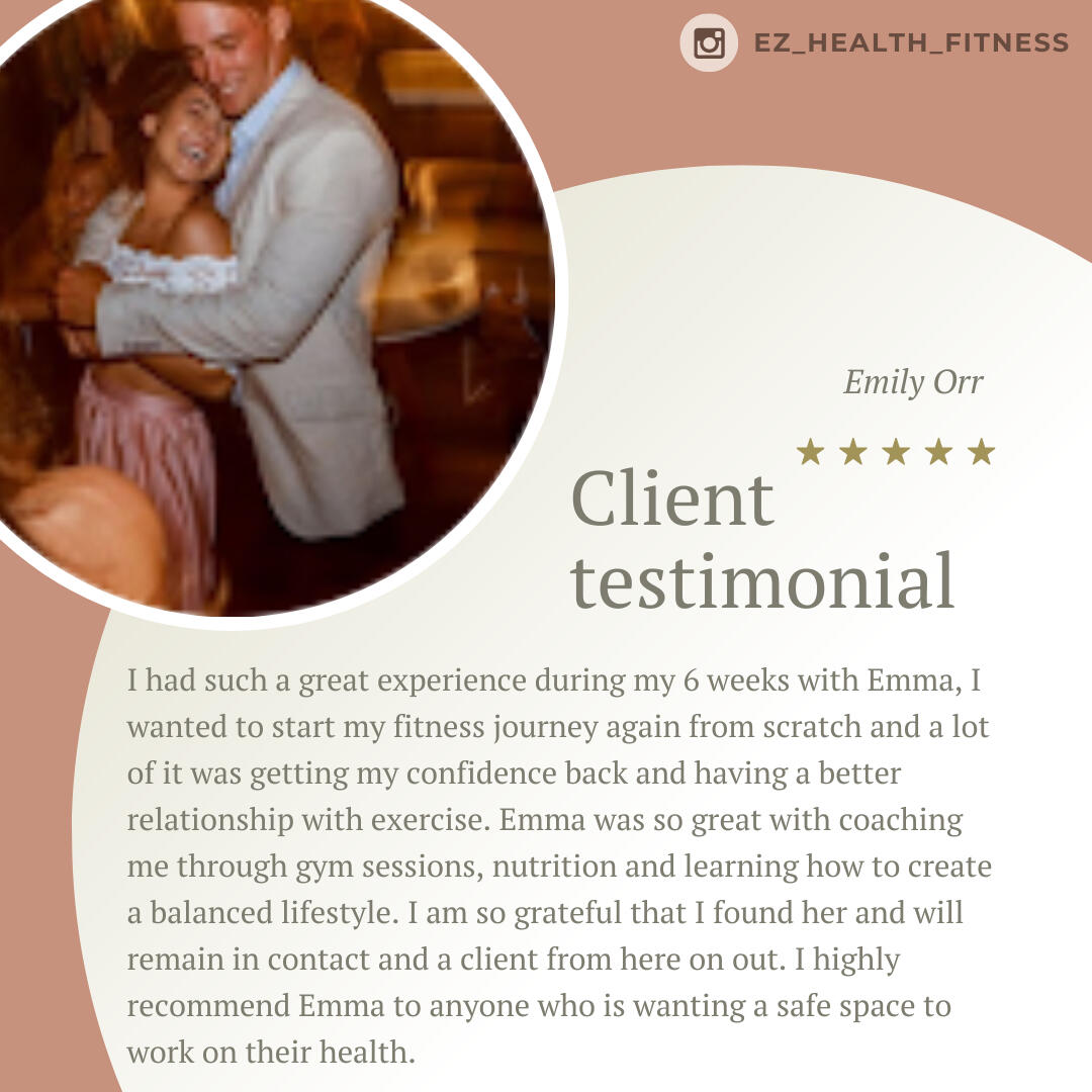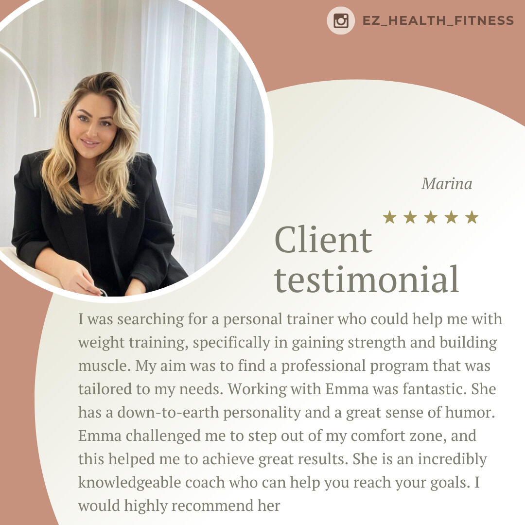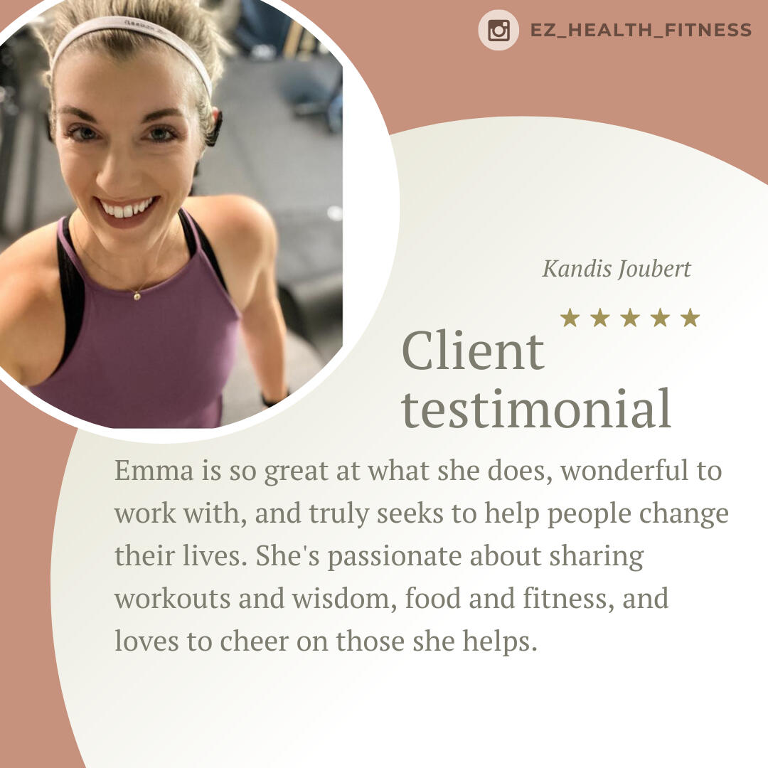 Emma is such a knowledgeable trainer. I really appreciate her attention to details when it comes to addressing my issues as a 47yo woman going through life changes. I am very fortunate to have had the opportunity to go through her program which covered proper nutrition, workout routines, and video check-ins. I have seen tremendous improvements in my nutrition and workouts from the lessons that I have learned. Thank you, Emma. I am forever grateful!