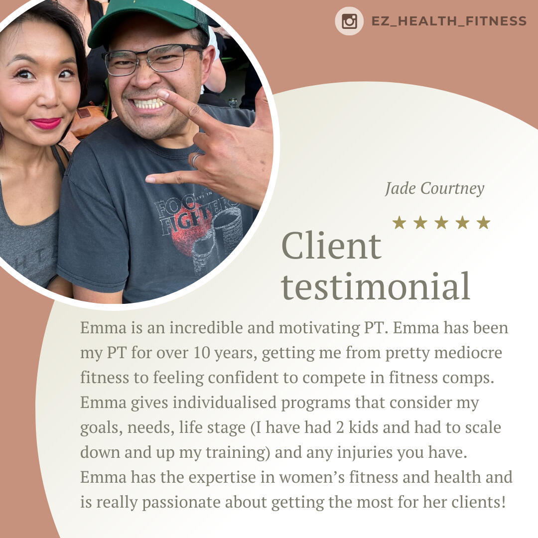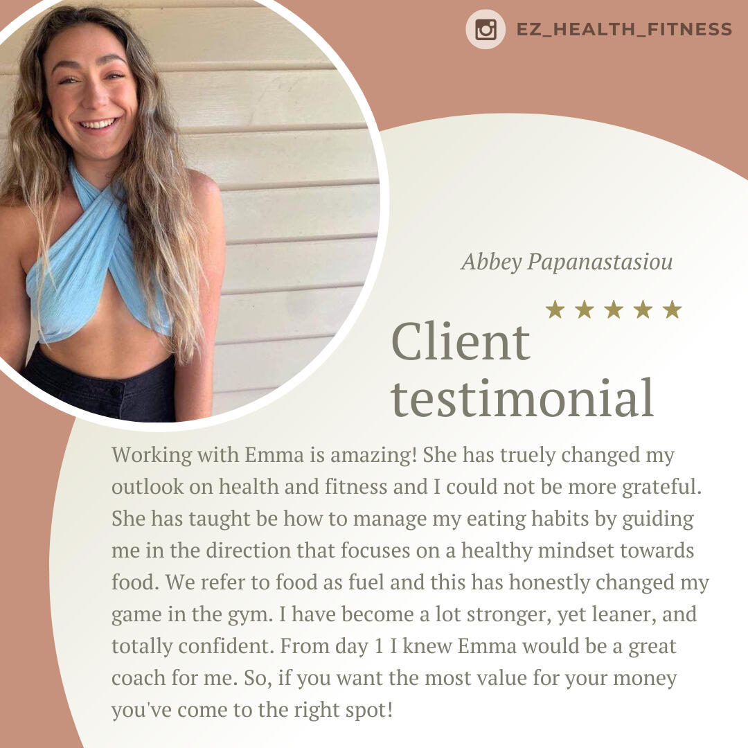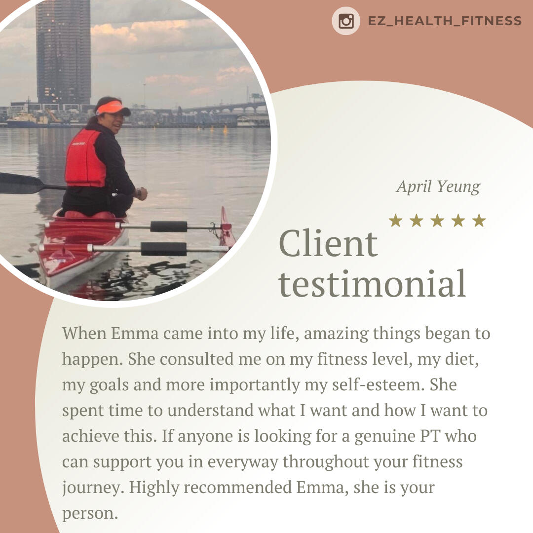 Emma is such a knowledgeable trainer. I really appreciate her attention to details when it comes to addressing my issues as a 47yo woman going through life changes. I am very fortunate to have had the opportunity to go through her program which covered proper nutrition, workout routines, and video check-ins. I have seen tremendous improvements in my nutrition and workouts from the lessons that I have learned. Thank you, Emma. I am forever grateful!