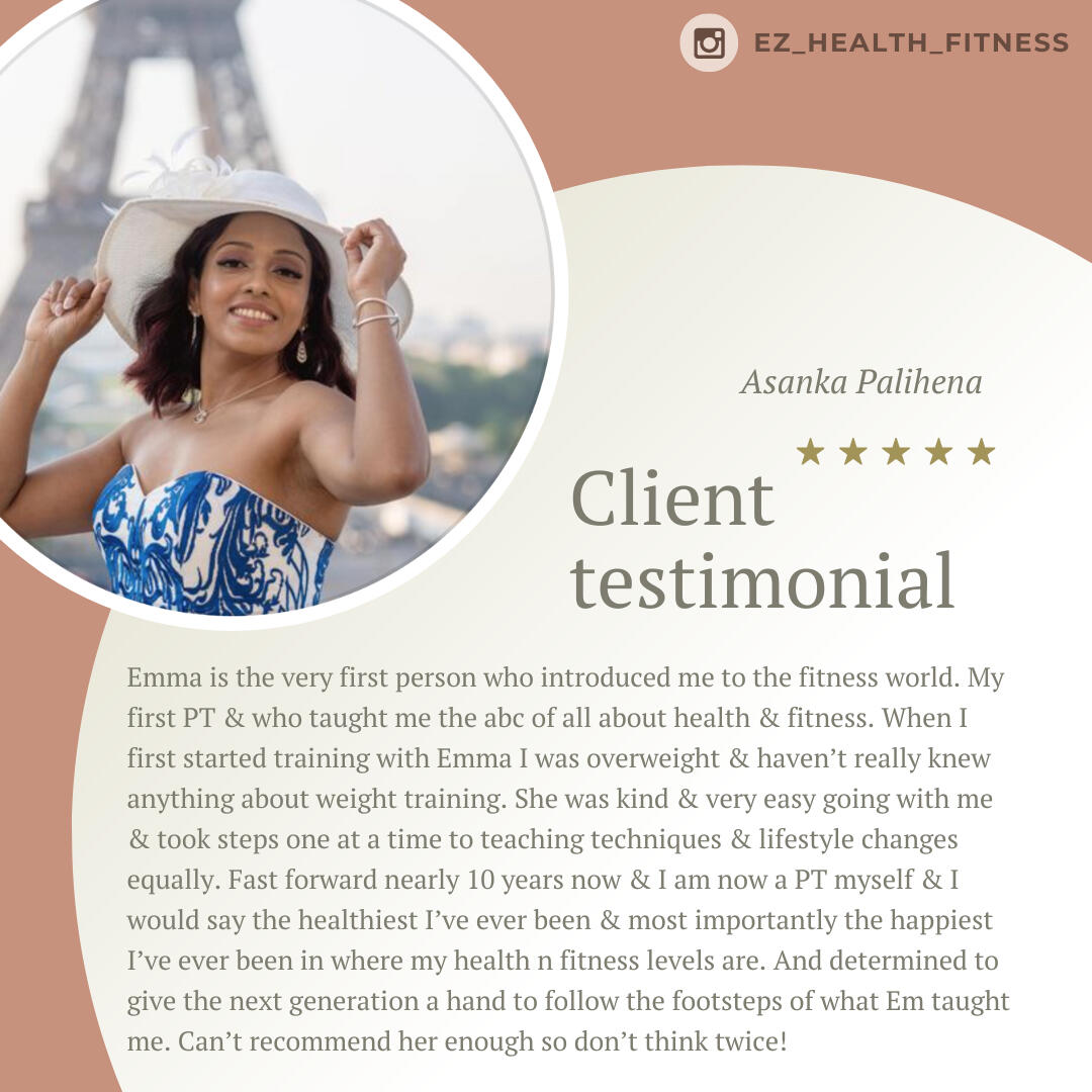 – Ann, 44When Emma came into my life, amazing things began to happen. She consulted me on my fitness level, my diet, my goals and more importantly my self-esteem. She spent time understanding what I want and how I want to achieve this. If anyone is looking for a genuine PT who can support you in every way throughout your fitness journey. Highly recommended Emma, she is your person.