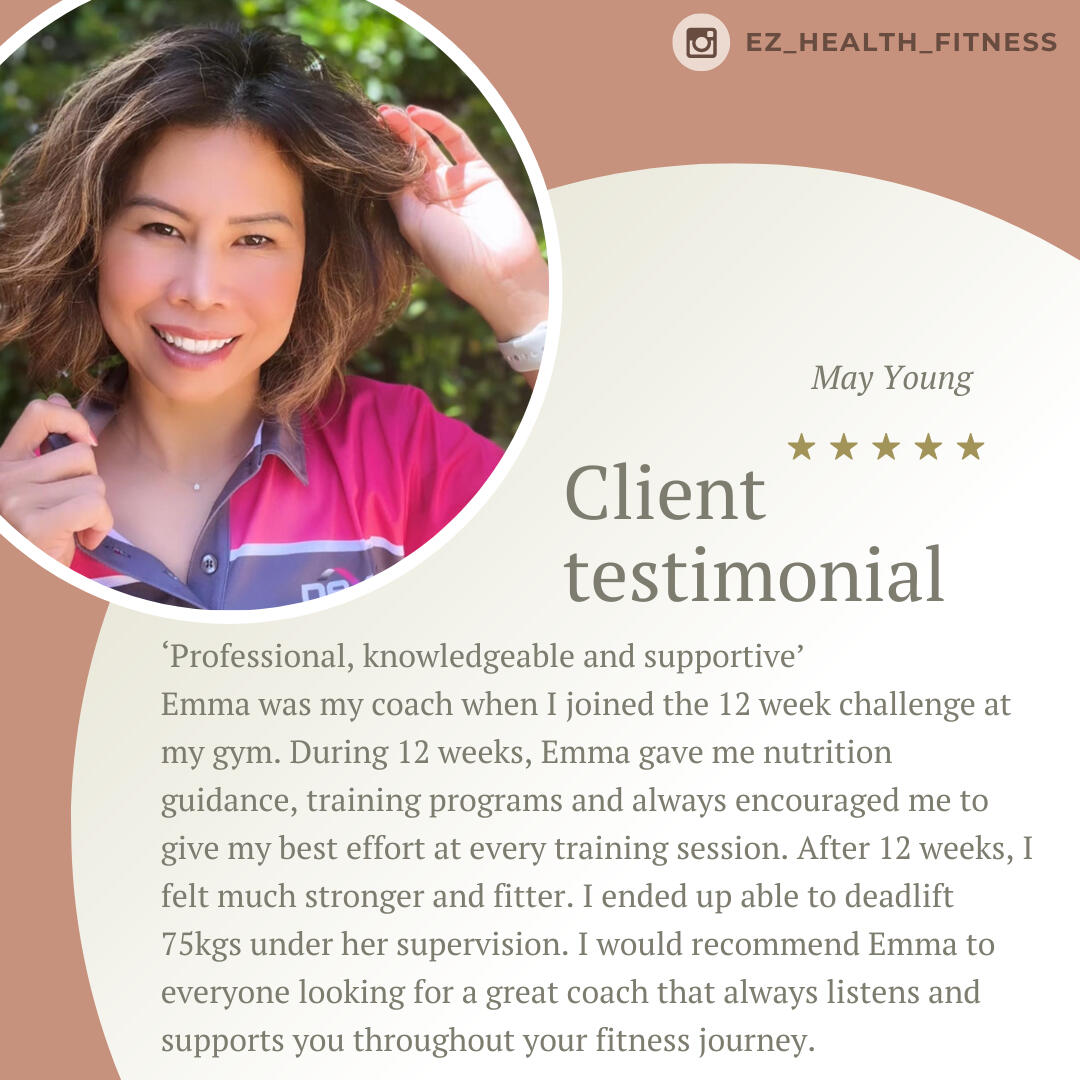 I'm Emma Zheng, a personal trainer with over 15 years of experience helping individuals in their 40s+ reclaim their bodies and live life to the fullest.My mission is to build strong individuals and a supportive community where we can grow and succeed together.My history into health and fitness started due to emotional eating, unhealthy habits, constant discomfort, and a lack of zest for life.Looking back, I'm sure I was suffering from some sort of a mental health issue.In 2010, my mum was diagnosed with an advanced form of breast cancer.Watching her endure months of chemotherapy was a wake-up call for me.Her strength in fighting the disease inspired me to start my own journey to improve my health, build a better lifestyle, and develop mental resilience.So, I hired my first trainer and joined a local CrossFit box.At the beginning, I couldn't even do a single push-up or run 200 meters without stopping to catch my breath.Now I can do strict ups, handstand push ups, deadlift 2x bodyweight, bench 80kgs and so much more.Being surrounded by a like-minded community inspired me to push past my limits and evolve into a better version of myself.The biggest lesson I learned is to cheer for yourself when no one else is.These days, I take my fitness outdoors, engaging in activities like hiking, surfing, climbing, and occasionally participating in local powerlifting competitions.I just turned 40 and feel stronger than I ever was in my 20s or 30s.I spend most of my time galavanting the world with my sister, sometimes engaging in adventures, like exploring cross-cultural experiences in Saudi Arabia or road-tripping along the coast of Costa Rica.If you’re going to embrace your 40s, 50s, and beyond, you might as well do it right!Three fun facts about me: