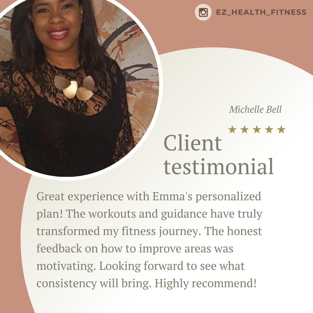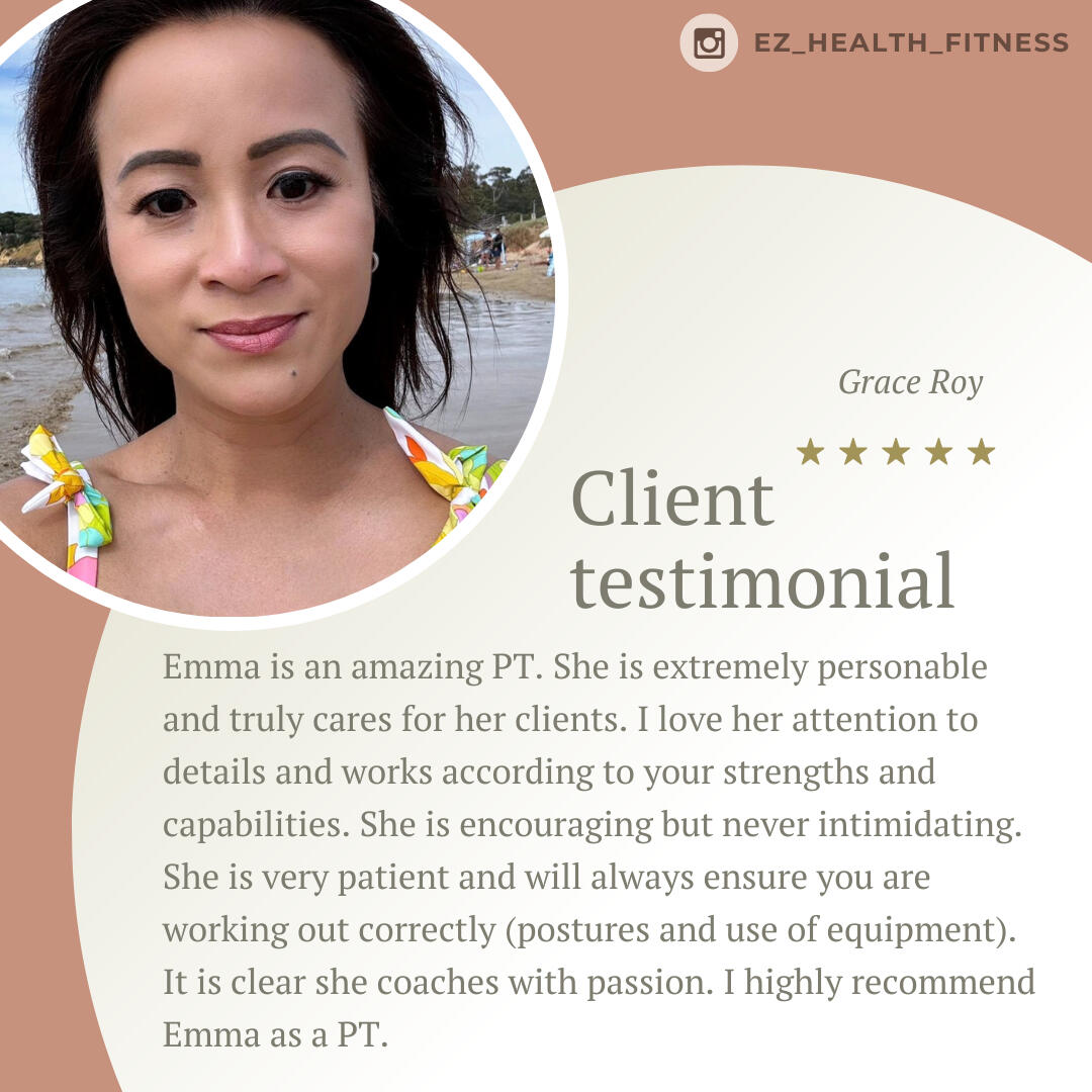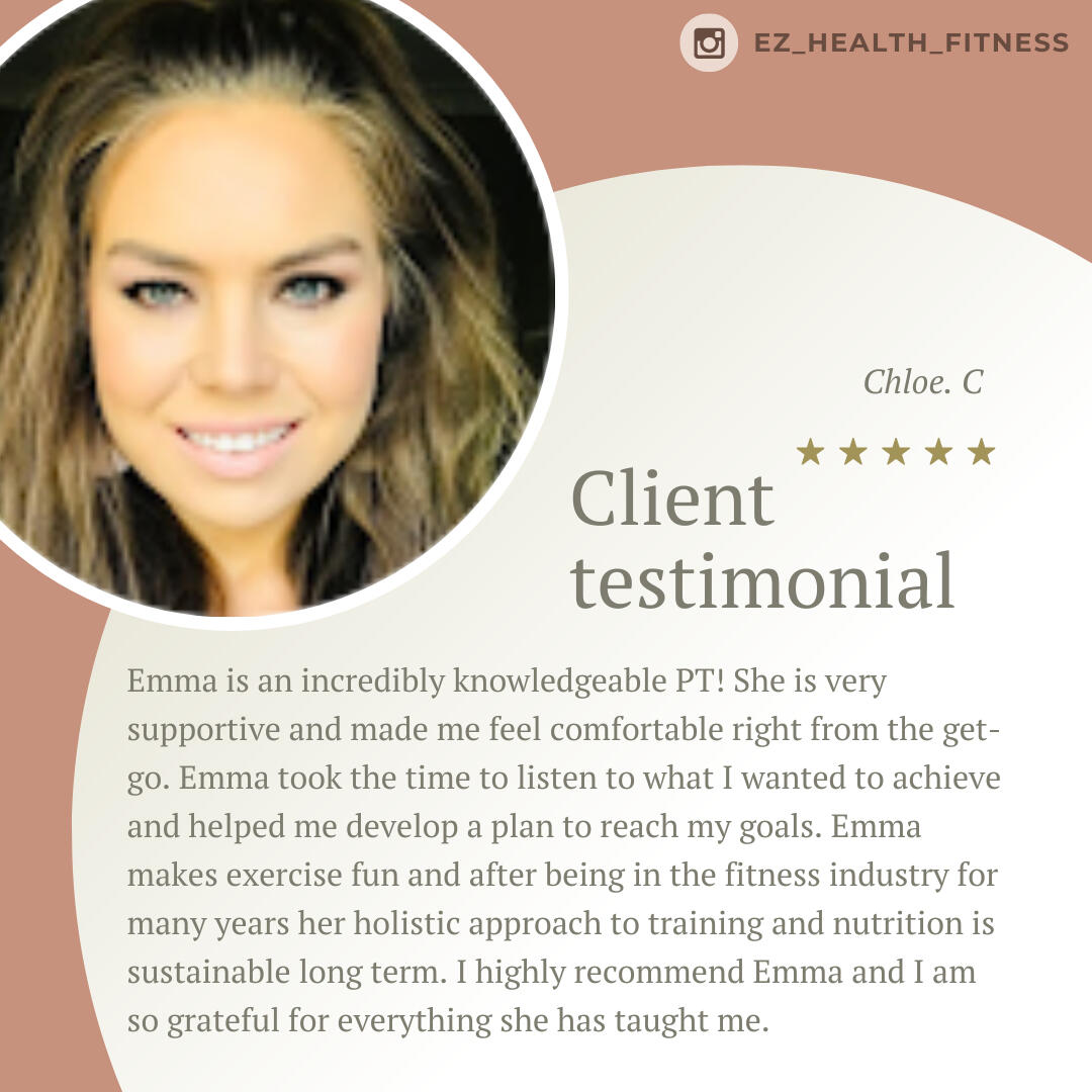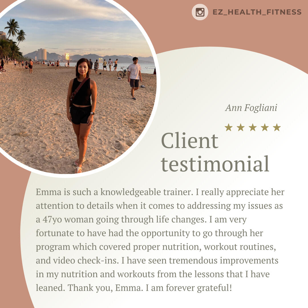 Emma is such a knowledgeable trainer. I really appreciate her attention to details when it comes to addressing my issues as a 47yo woman going through life changes. I am very fortunate to have had the opportunity to go through her program which covered proper nutrition, workout routines, and video check-ins. I have seen tremendous improvements in my nutrition and workouts from the lessons that I have learned. Thank you, Emma. I am forever grateful!