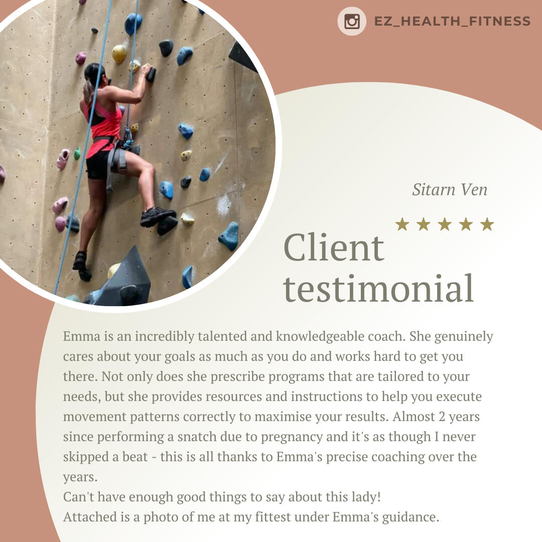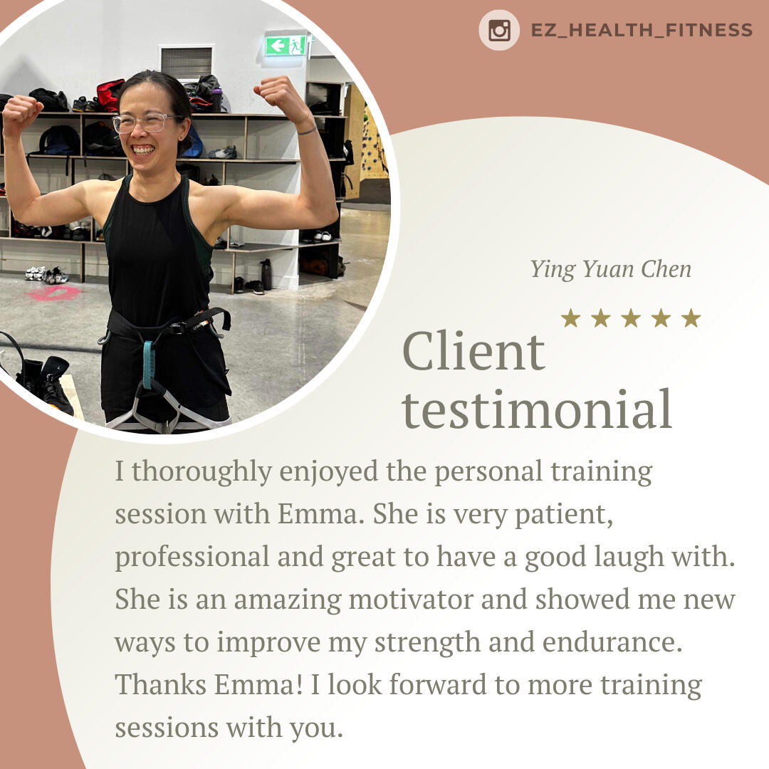 I'm Emma Zheng, a personal trainer with over 15 years of experience helping individuals in their 40s+ reclaim their bodies and live life to the fullest.My mission is to build strong individuals and a supportive community where we can grow and succeed together.My history into health and fitness started due to emotional eating, unhealthy habits, constant discomfort, and a lack of zest for life.Looking back, I'm sure I was suffering from some sort of a mental health issue.In 2010, my mum was diagnosed with an advanced form of breast cancer.Watching her endure months of chemotherapy was a wake-up call for me.Her strength in fighting the disease inspired me to start my own journey to improve my health, build a better lifestyle, and develop mental resilience.So, I hired my first trainer and joined a local CrossFit box.At the beginning, I couldn't even do a single push-up or run 200 meters without stopping to catch my breath.Now I can do strict ups, handstand push ups, deadlift 2x bodyweight, bench 80kgs and so much more.Being surrounded by a like-minded community inspired me to push past my limits and evolve into a better version of myself.The biggest lesson I learned is to cheer for yourself when no one else is.These days, I take my fitness outdoors, engaging in activities like hiking, surfing, climbing, and occasionally participating in local powerlifting competitions.I just turned 40 and feel stronger than I ever was in my 20s or 30s.I spend most of my time galavanting the world with my sister, sometimes engaging in adventures, like exploring cross-cultural experiences in Saudi Arabia or road-tripping along the coast of Costa Rica.If you’re going to embrace your 40s, 50s, and beyond, you might as well do it right!Three fun facts about me: